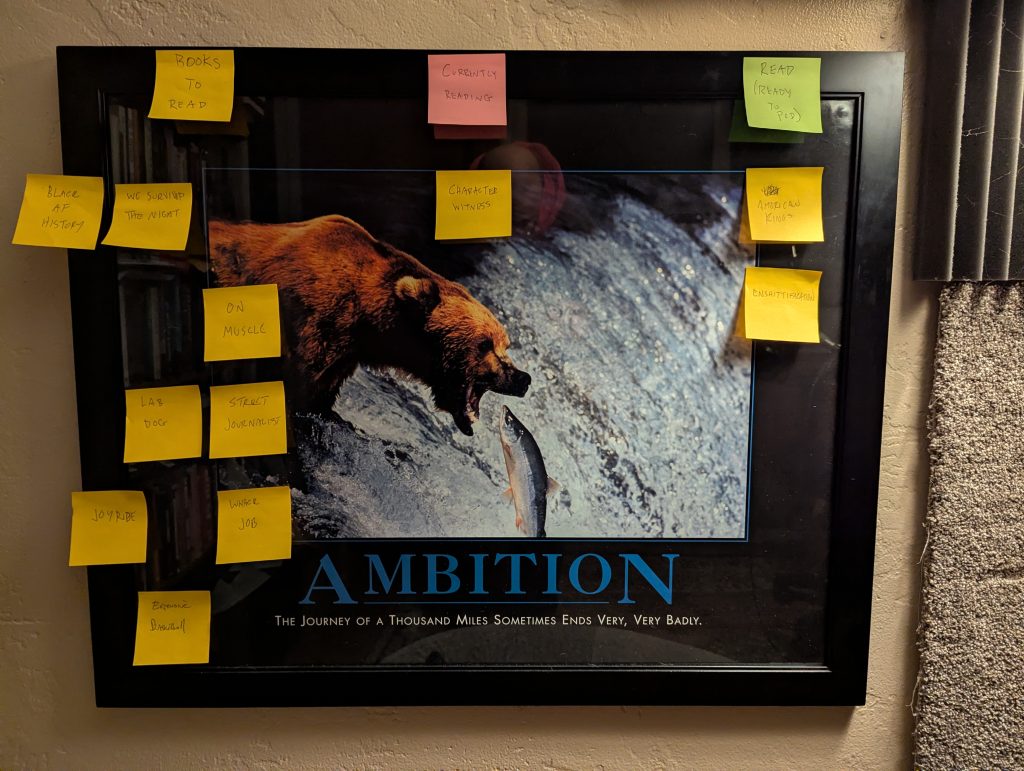 I have almost no wall space in my studio. It’s covered in foam and demotivating posters, like the one you see above. [Ambition: The journey of a thousand miles sometimes ends very, very badly.] The glue doesn’t like glass that much.